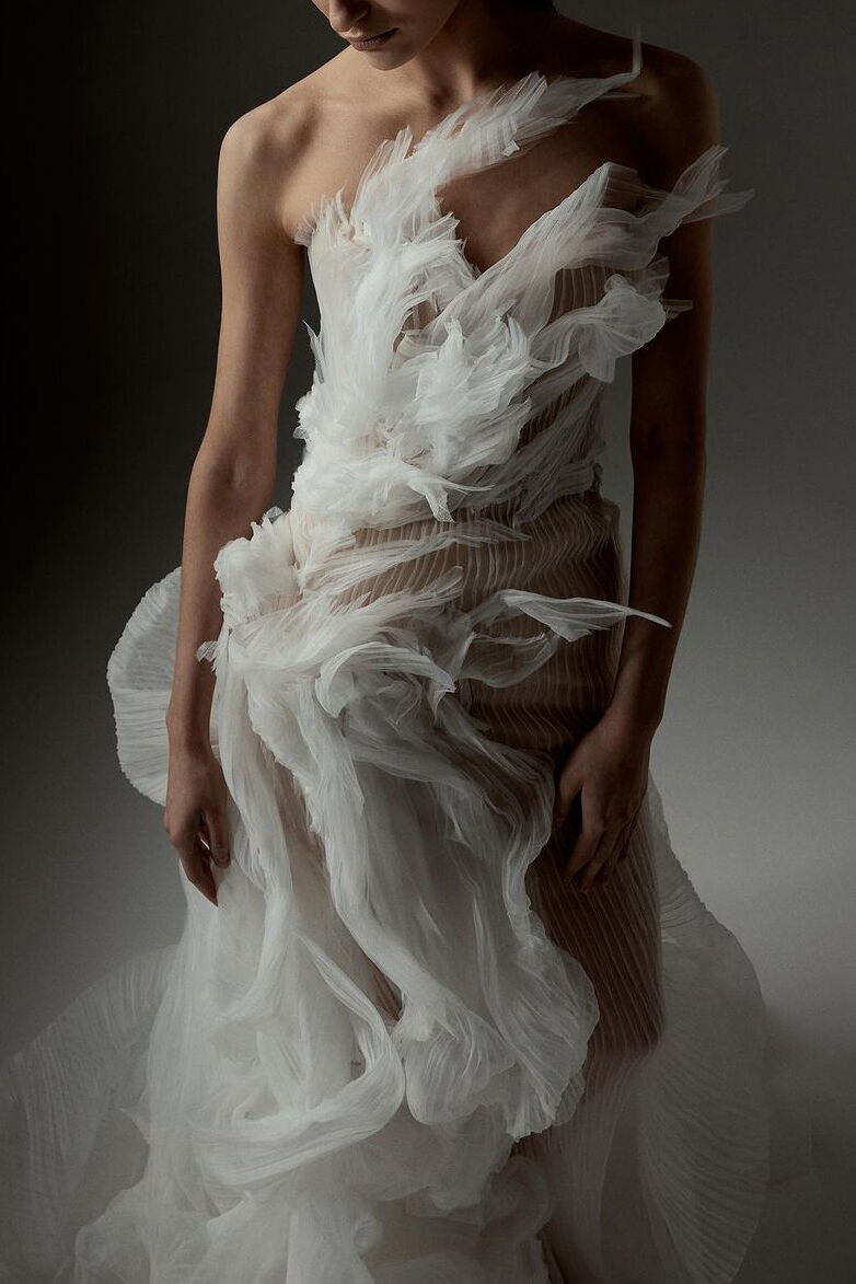 From sculpted bodices in cloud-like layers to embellishment mimicking the shape of water – our highlights from New York Bridal Fashion Week Spring ’25.