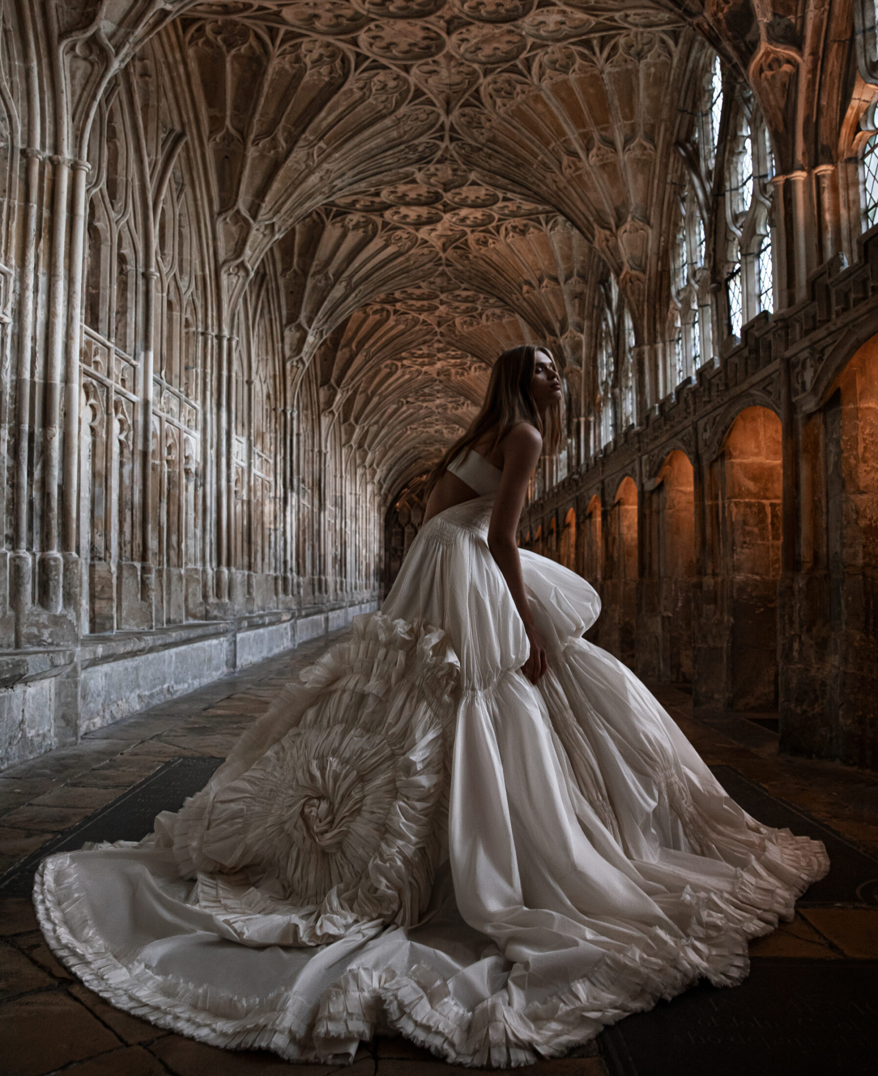 Inside ornate cathedral walls, decadent gowns, couture-like detailing, and artisanal jewels celebrate the poetry of craftsmanship and the allure of slow.