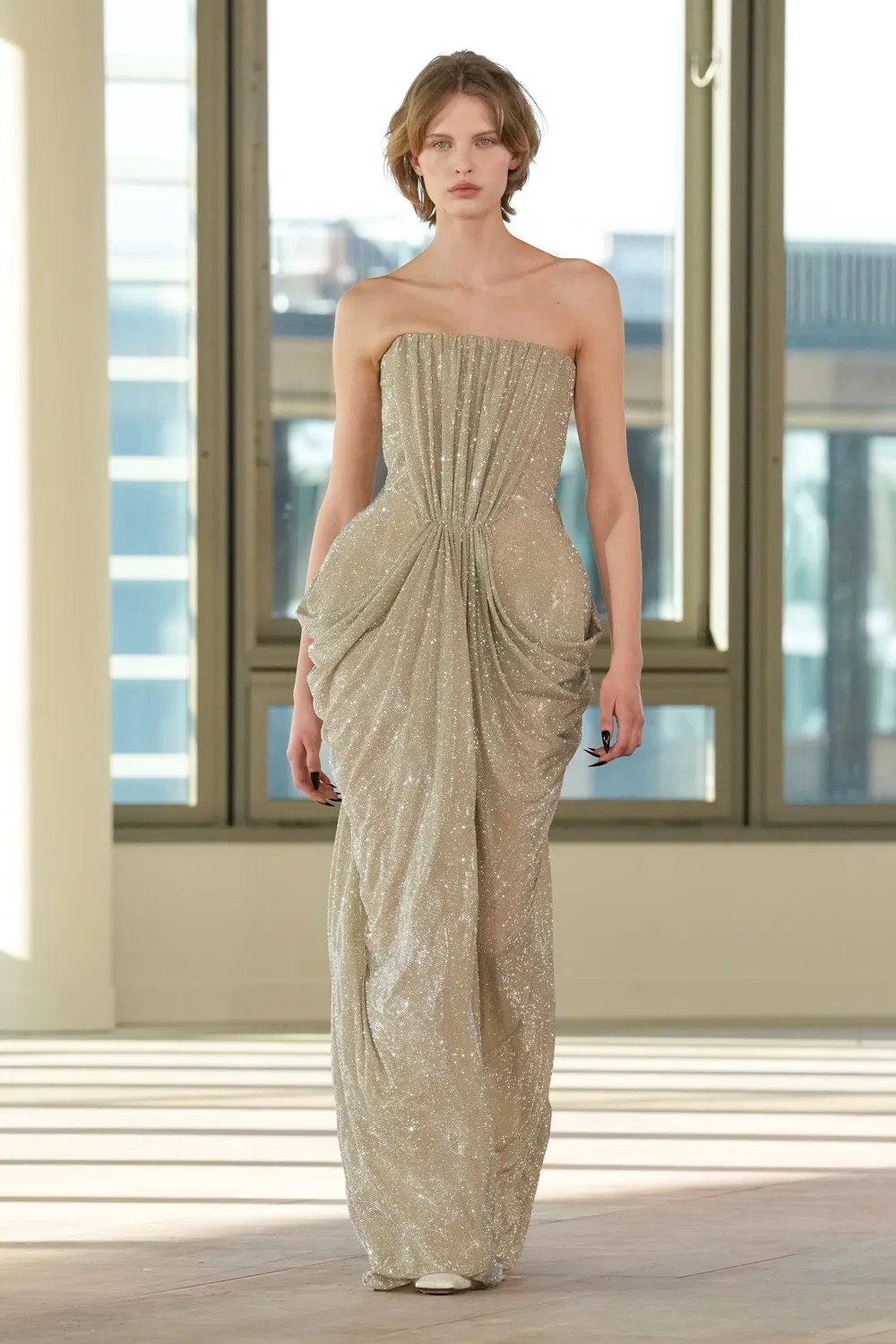 Tracing the line between architecture and emotion, Alyssa Kristin’s Spring 2026 gowns evoke sculptural columns softened by fluid draping, where purity of form meets quiet transformation.