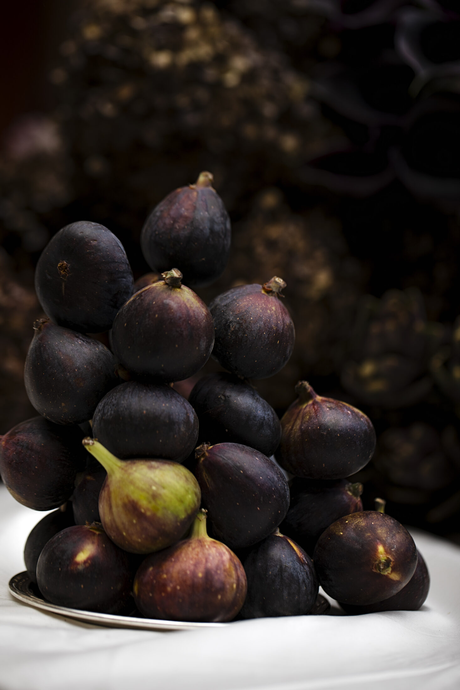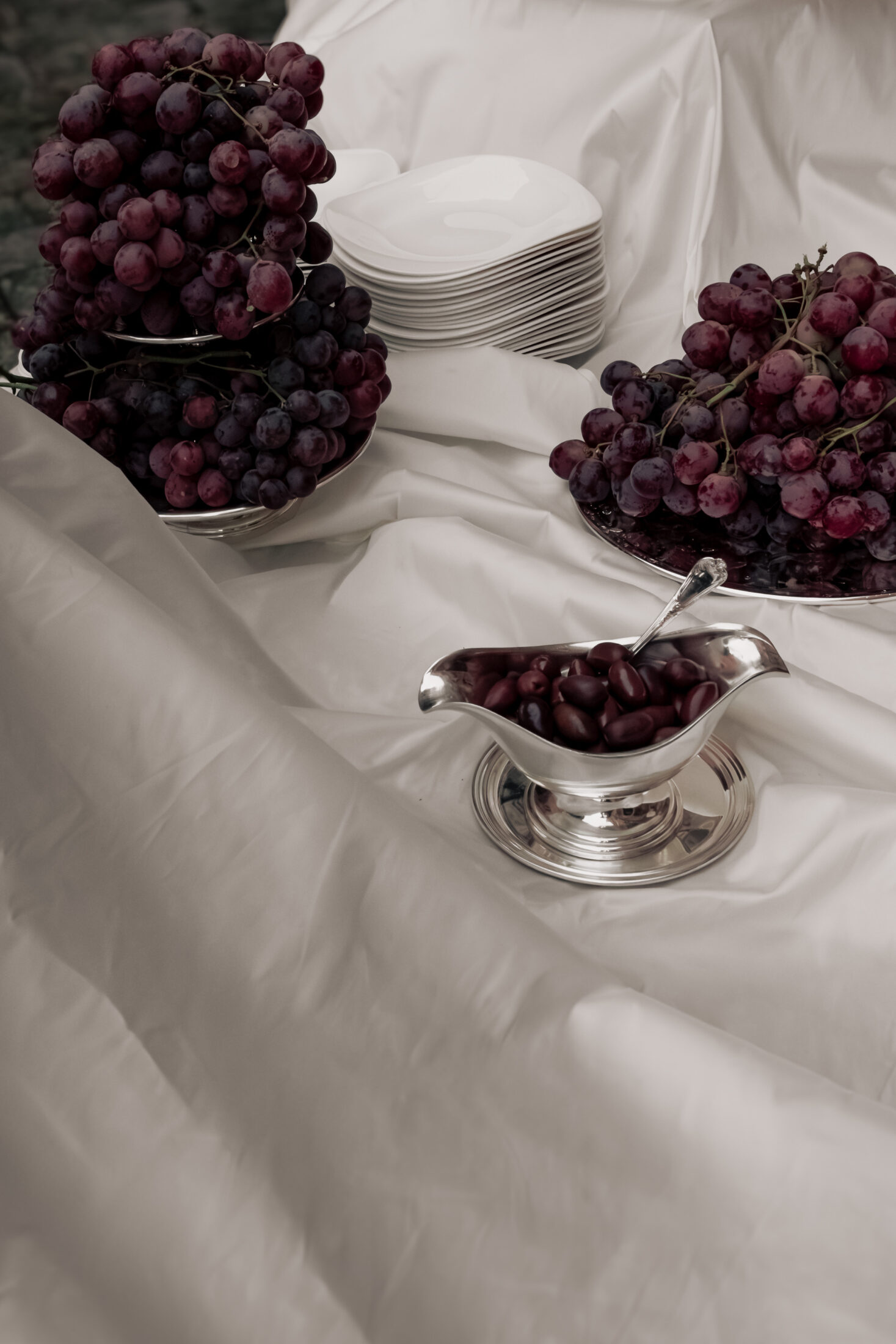 Creating a luxuriously abundant table feast, sculptural accents in deep wine hues were contrasted with notes of chestnut. Raw, vibrant fruits and vegetables in deep aubergine tones cascaded. Balanced by architectural wheels of cheese, flatbreads and breads were masterfully fragmented.