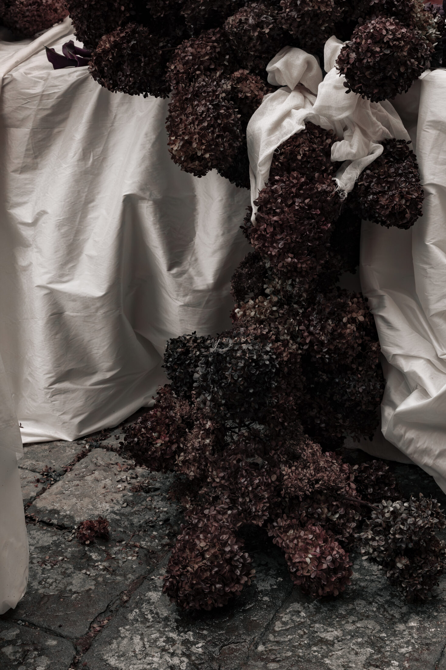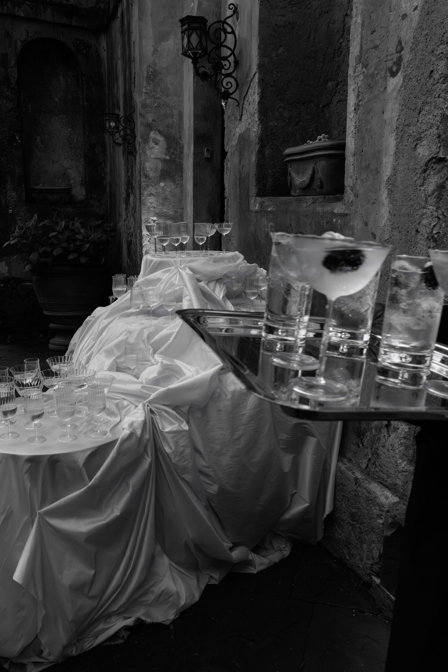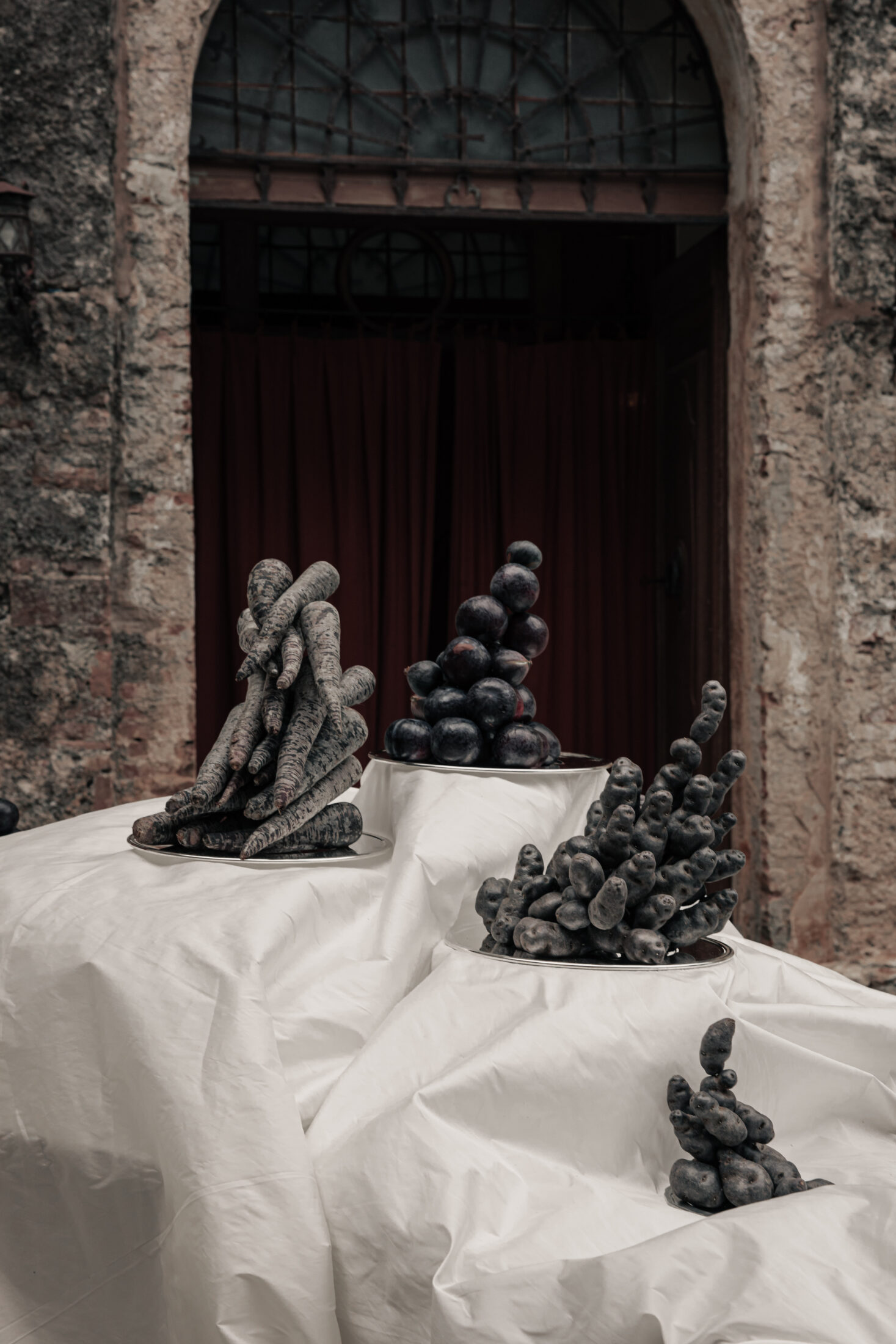 Unfolding in decadence, rich fabrics stood against the majesty of timeworn stone and brick walls. Sculptural fabrications and billowing silks were knotted and tied in oversized proportions by artist Mia Sylvia, transforming the main serpentine tablescape and event space.
