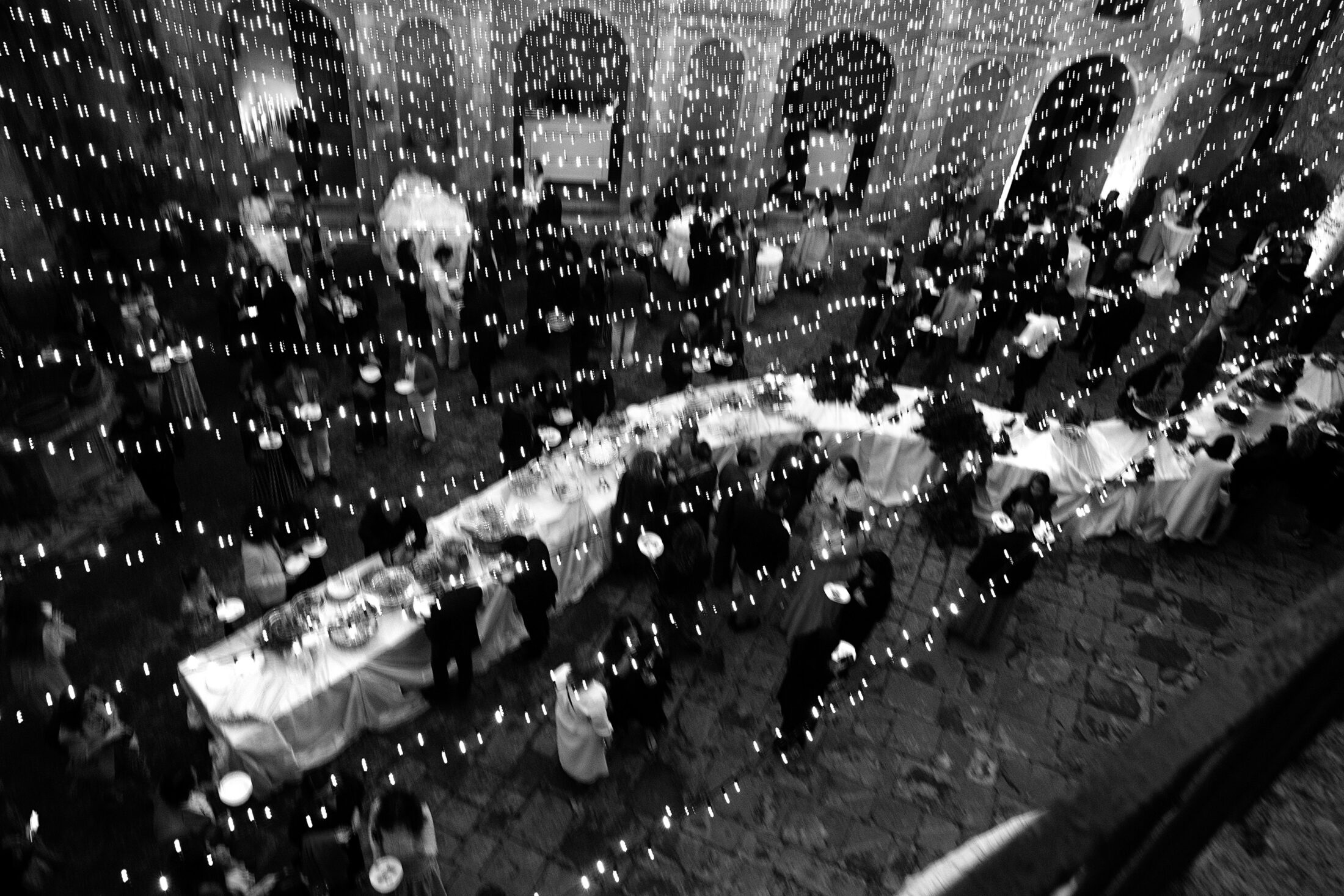 Spilling over the castle walls, magical lighting by Namida Events draped over the courtyard casting a dramatic glow.