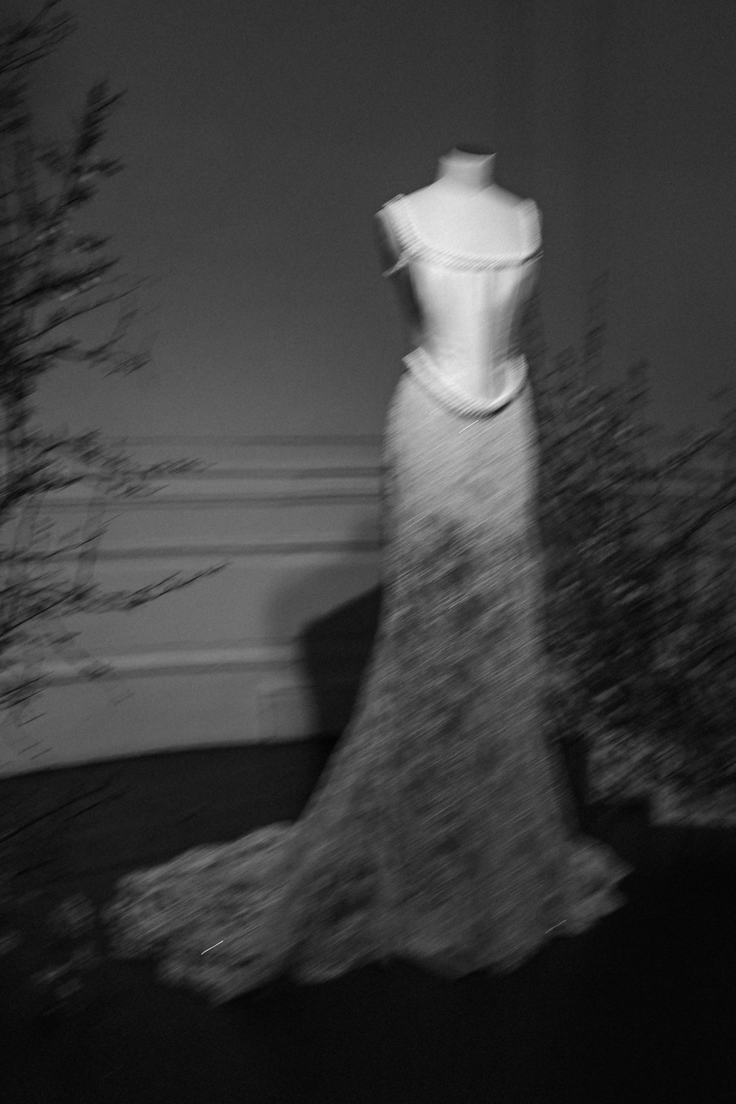 An elemental landscape rich in contrast — where beauty distills into shape and form. A rush of hibernal drama — couture silhouettes emerge from Switzerland’s wintry expanse as if carved by wind.