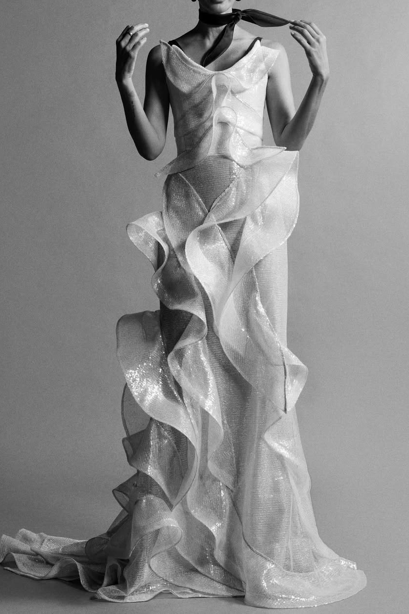 This season, New York Fall '25 collections redefine wedding guest attire with a balance of bare and gilded sheerness set against deep, moody tones and rich textures.