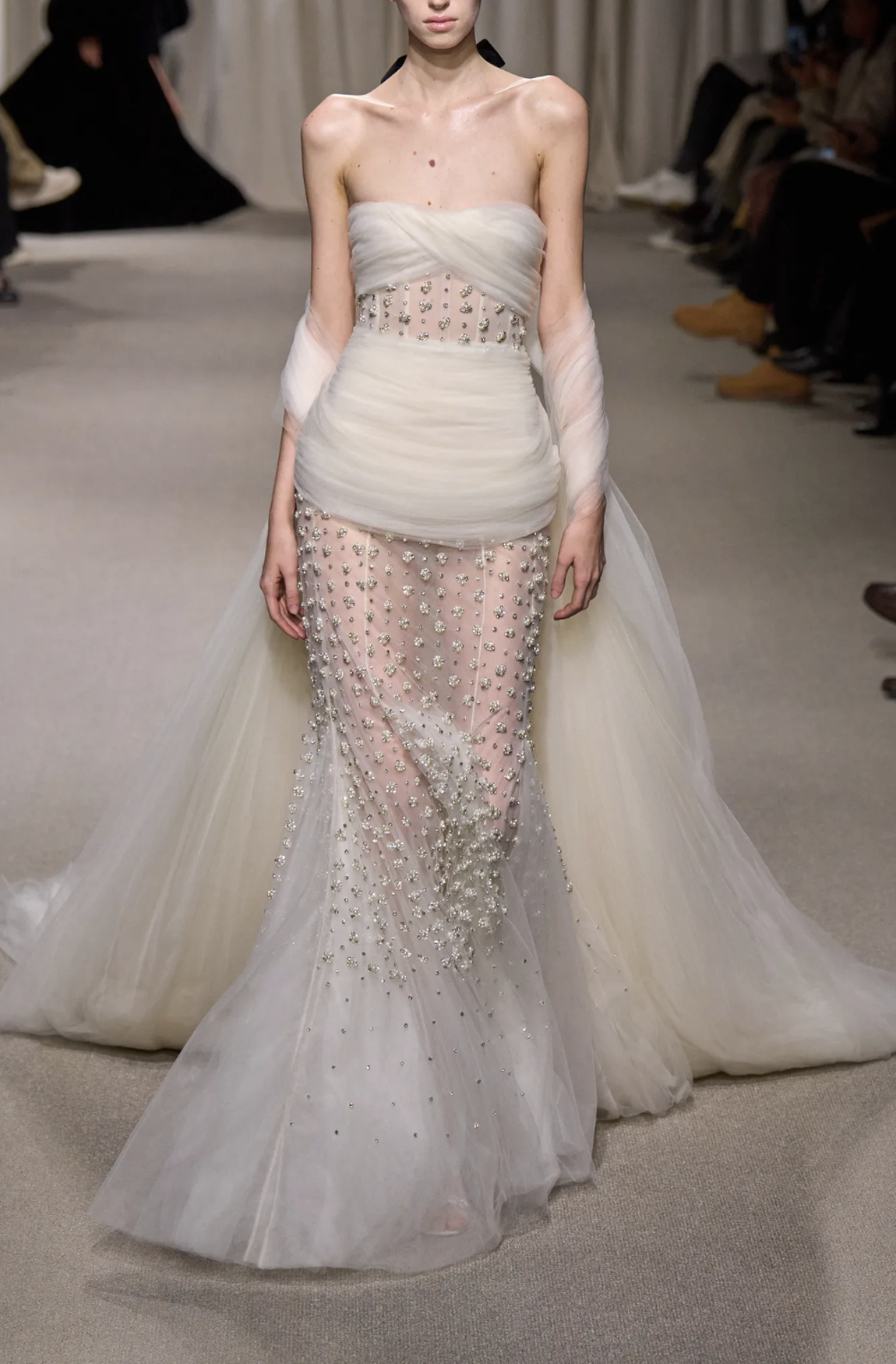 As fashion month comes to an end, in Paris, layers of textiles, sheer overlays, and fluid fabrics cascading over structured forms are curated for bridal reception dress inspiration.