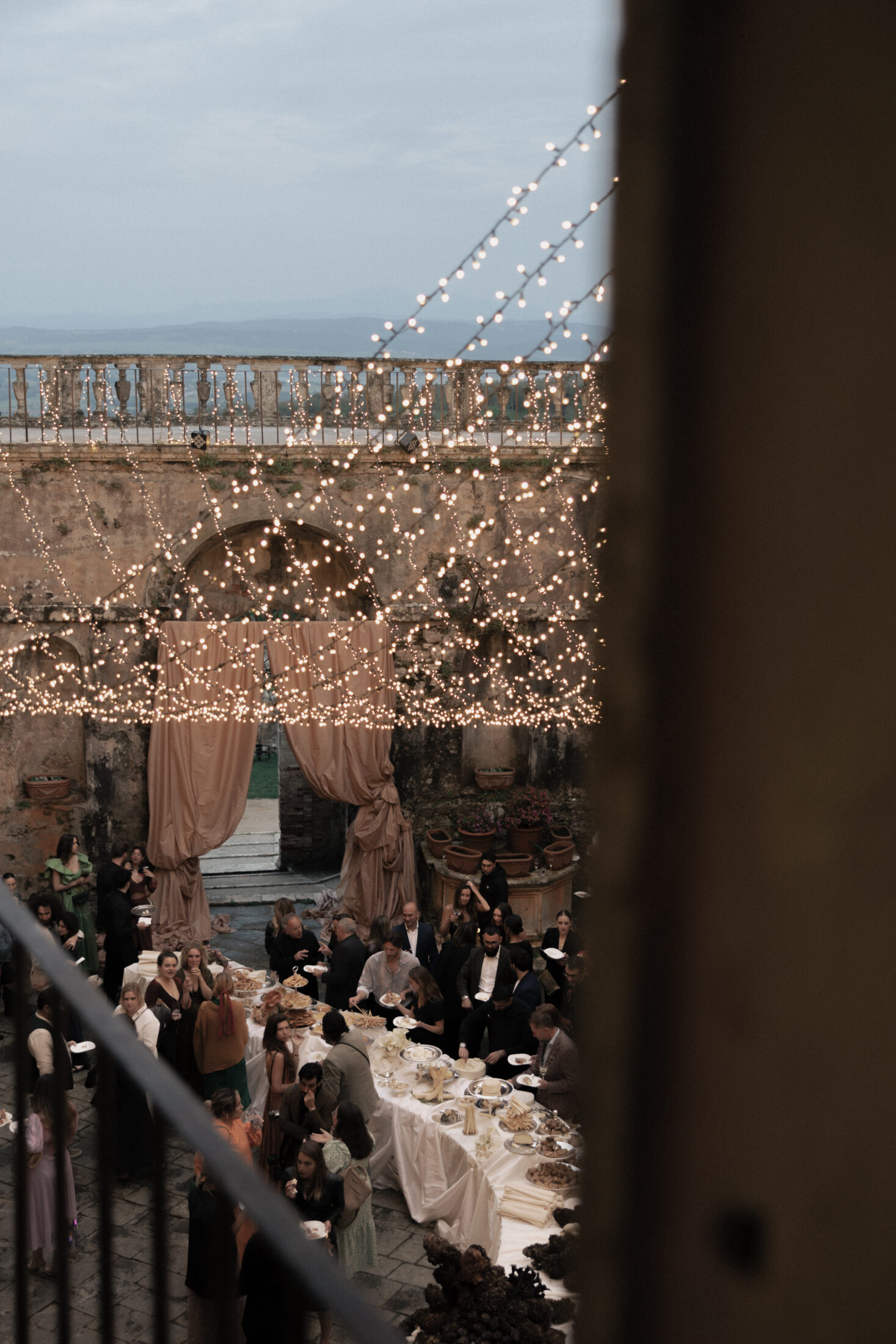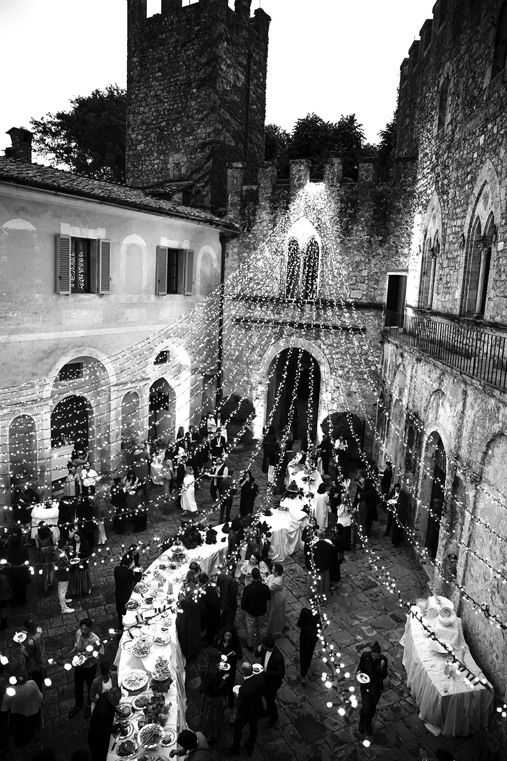 Spilling over the castle walls, magical lighting by Namida Events draped over the courtyard casting a dramatic glow.