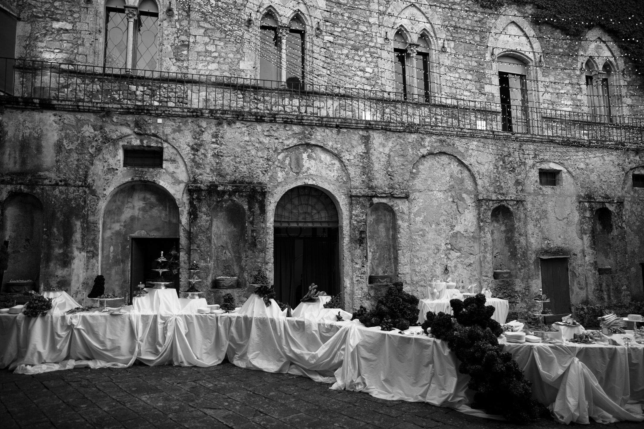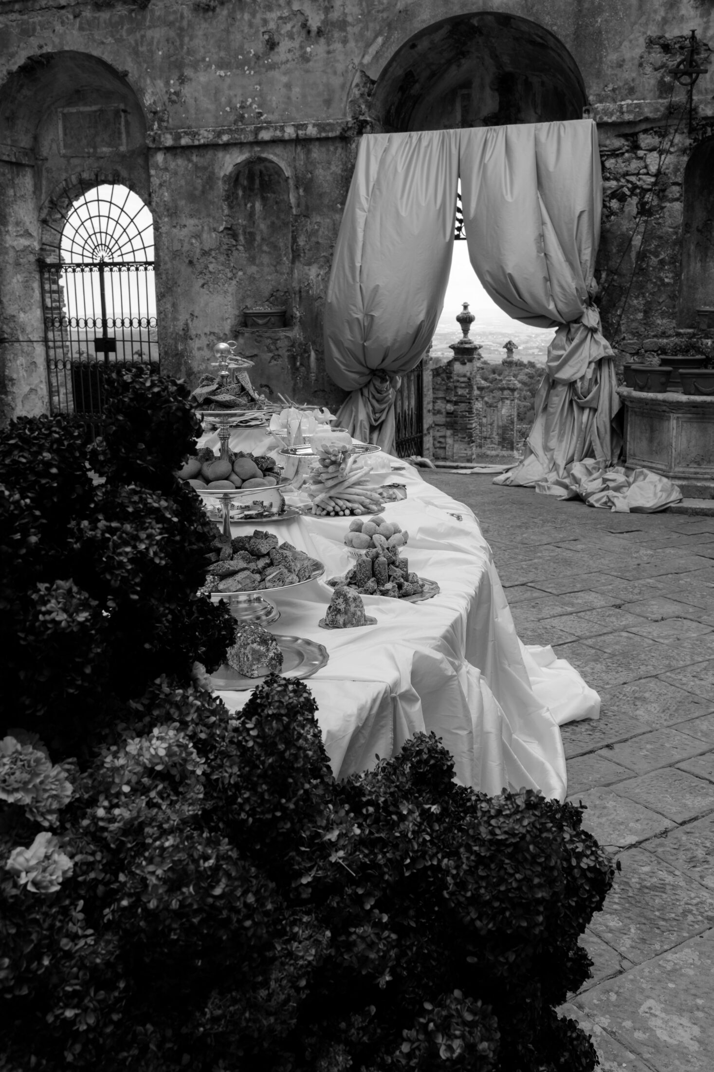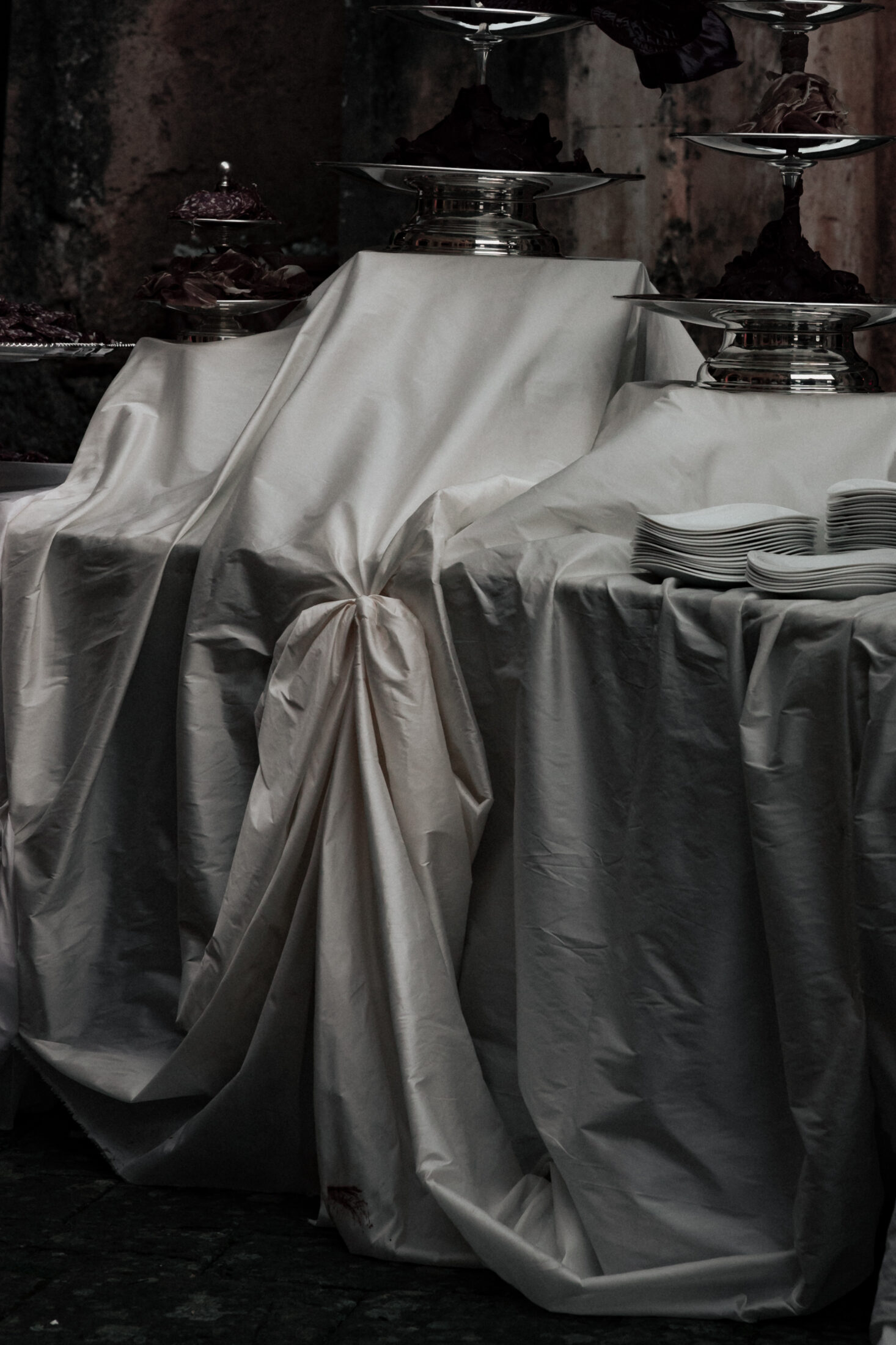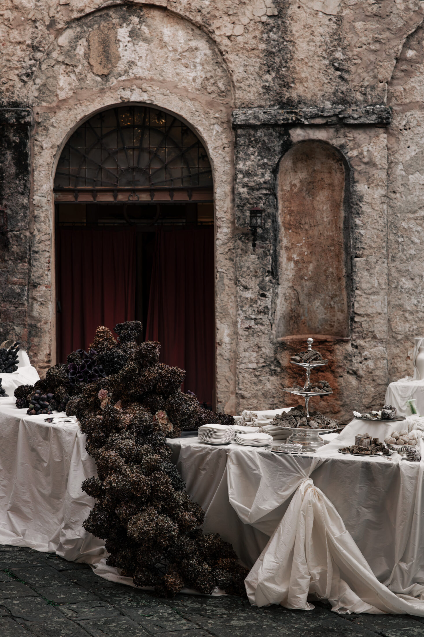 Unfolding in decadence, rich fabrics stood against the majesty of timeworn stone and brick walls. Sculptural fabrications and billowing silks were knotted and tied in oversized proportions by artist Mia Sylvia, transforming the main serpentine tablescape and event space.