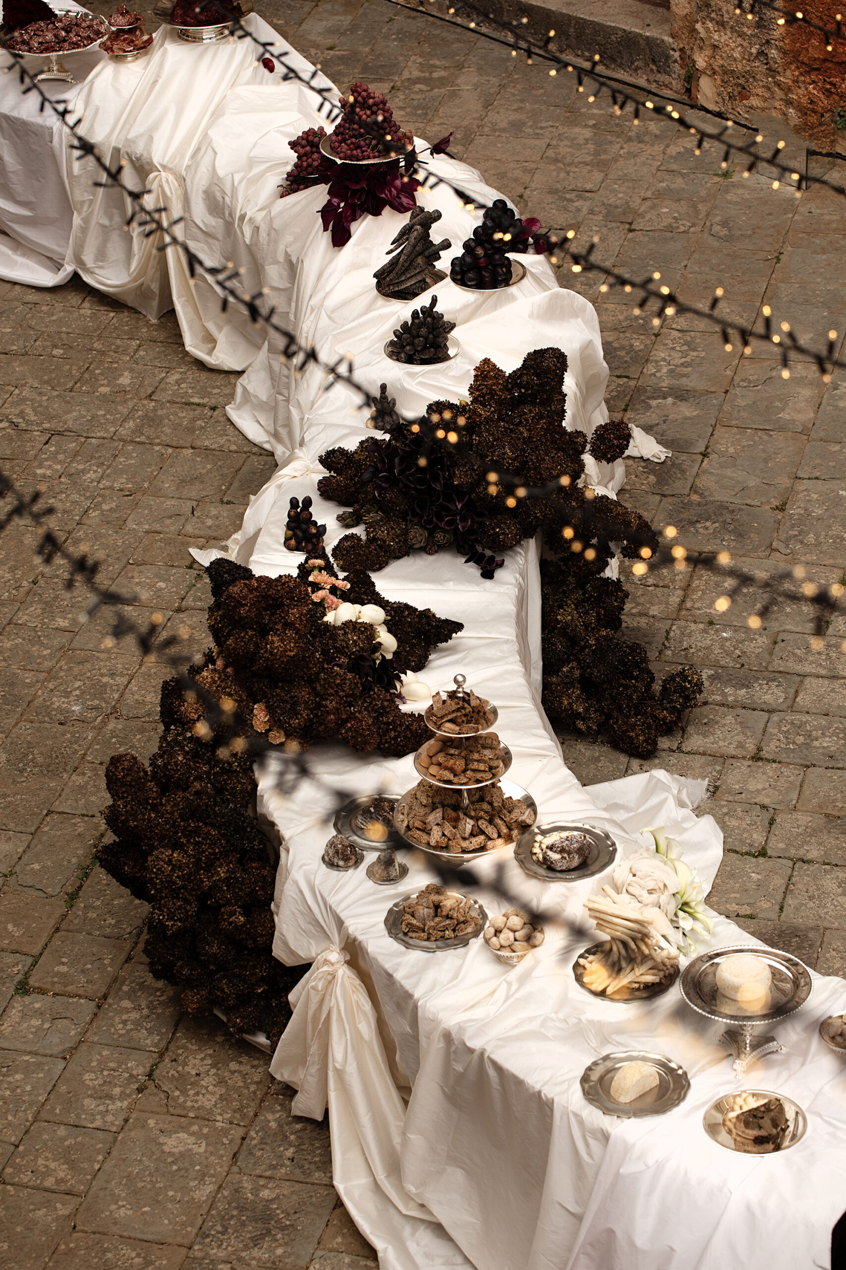A dramatic winding table meandered through the center of Castello di Celsa’s angular courtyard bringing fluidity to the ancient poetry of the space. Inspired by the Tuscan region and the art of European dining, the table setting radiated in inimitable beauty, layered with texture, color, and depth.